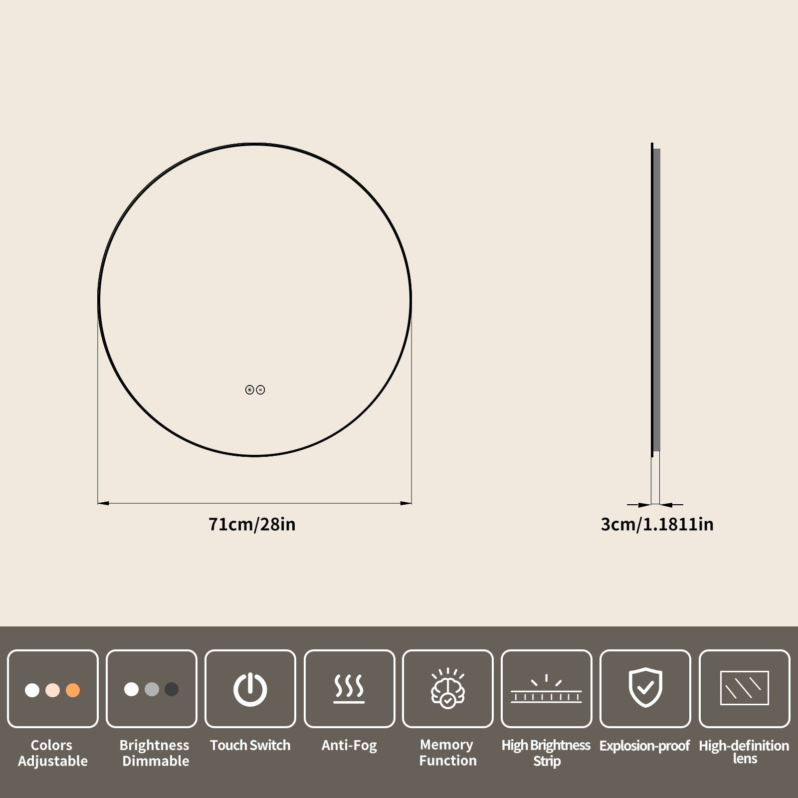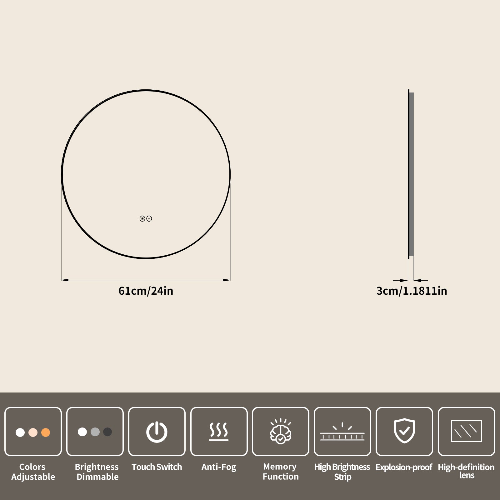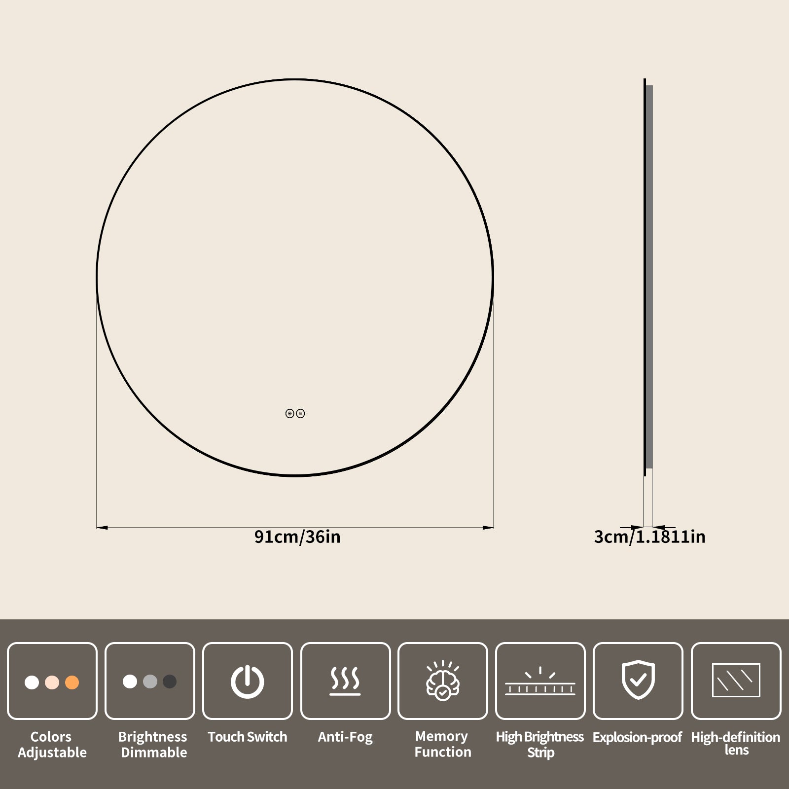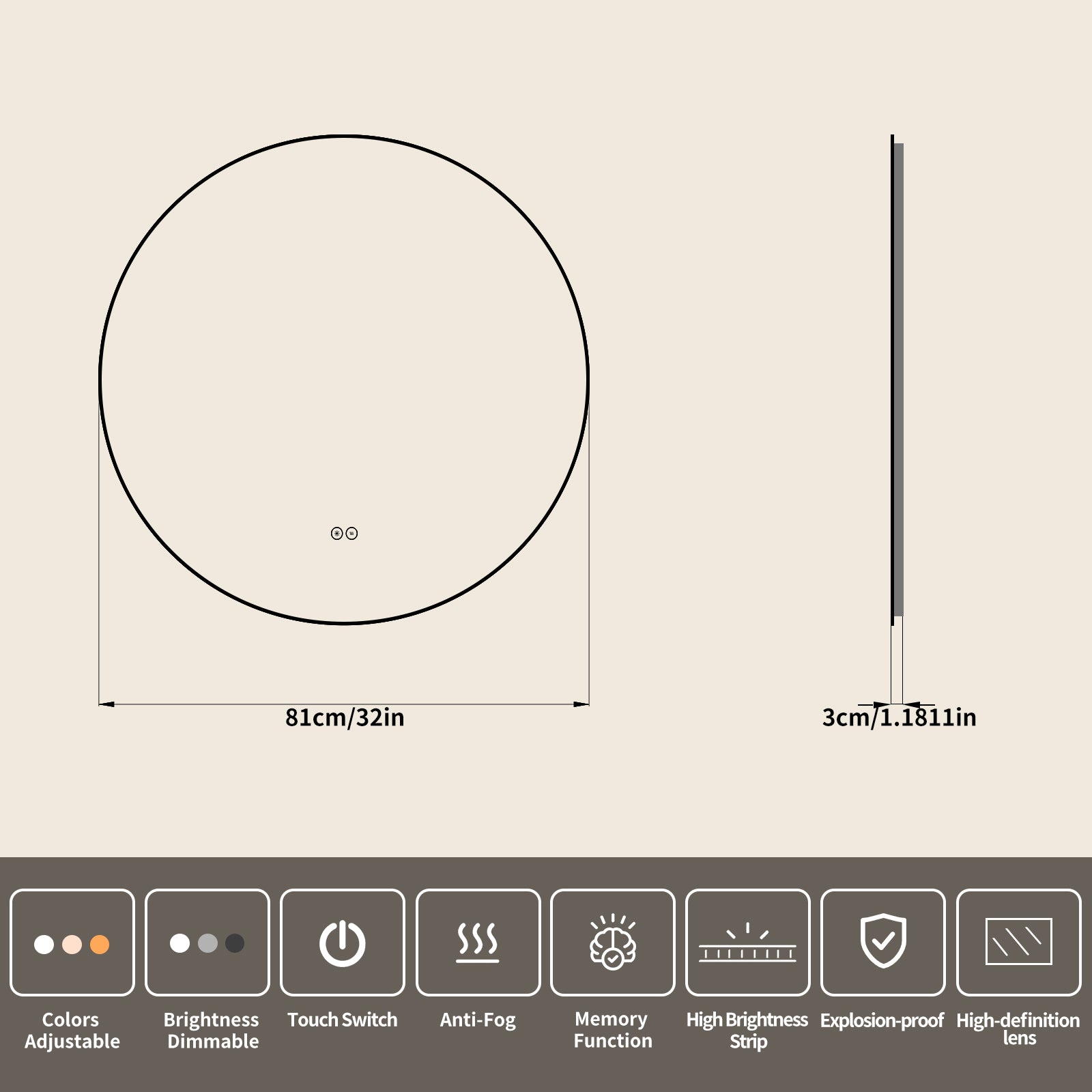 This wall-mounted frameless round LED bathroom vanity mirror is made of 5mm environmental silver mirror. Its round design softens the sharp lines of the bathroom space, while offering moisture resistance, durability and clear distortion-free reflection. It integrates a waterproof circular LED light (with 3 color modes and dimmable function), a full-surface fast defogging system and explosion-proof technology, and comes with complete installation accessories and a detailed manual. Its symmetric round design facilitates easy installation, meeting various grooming needs.