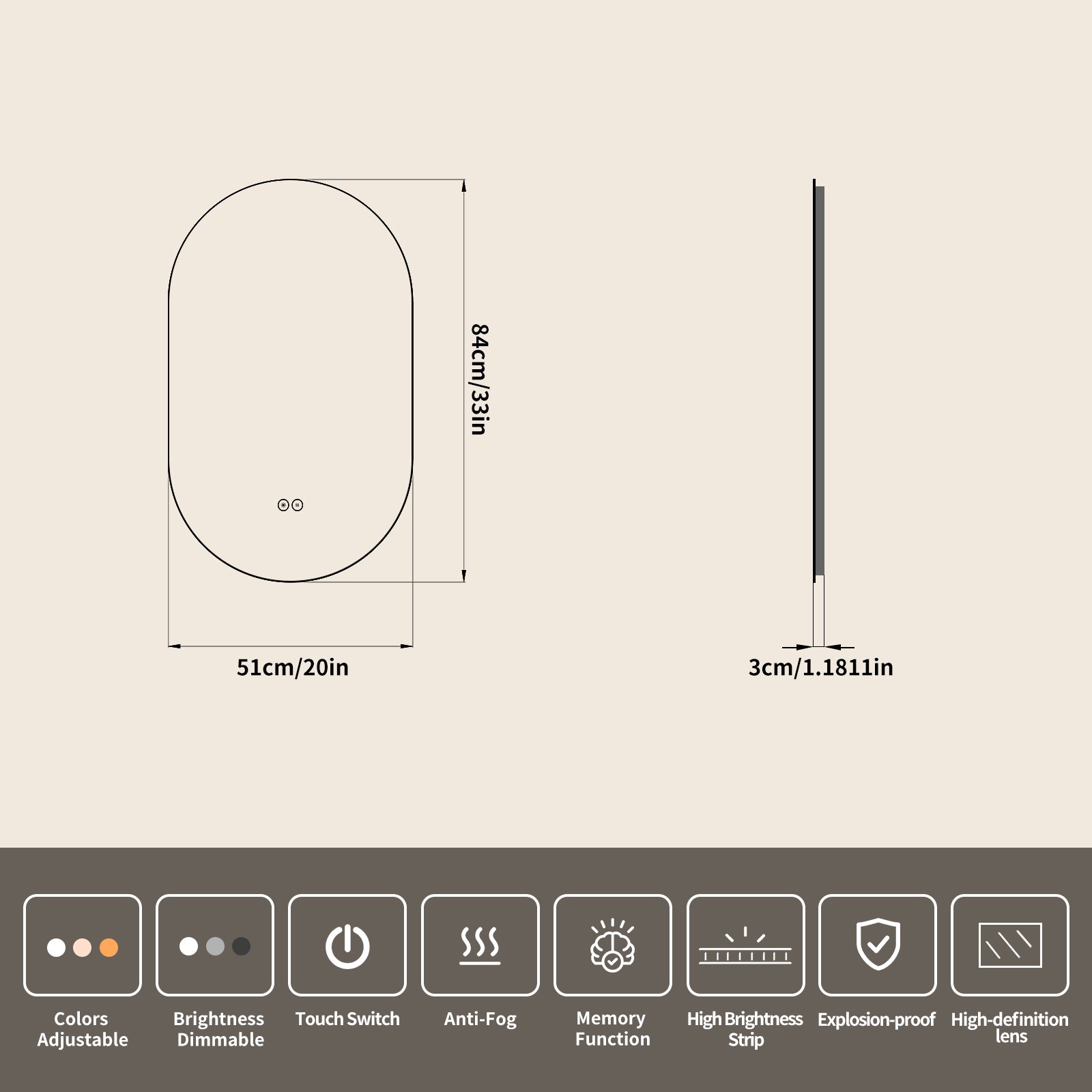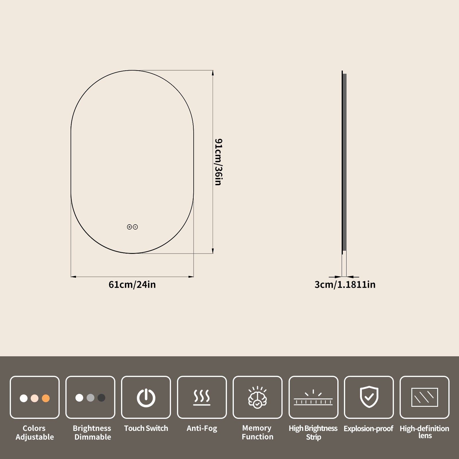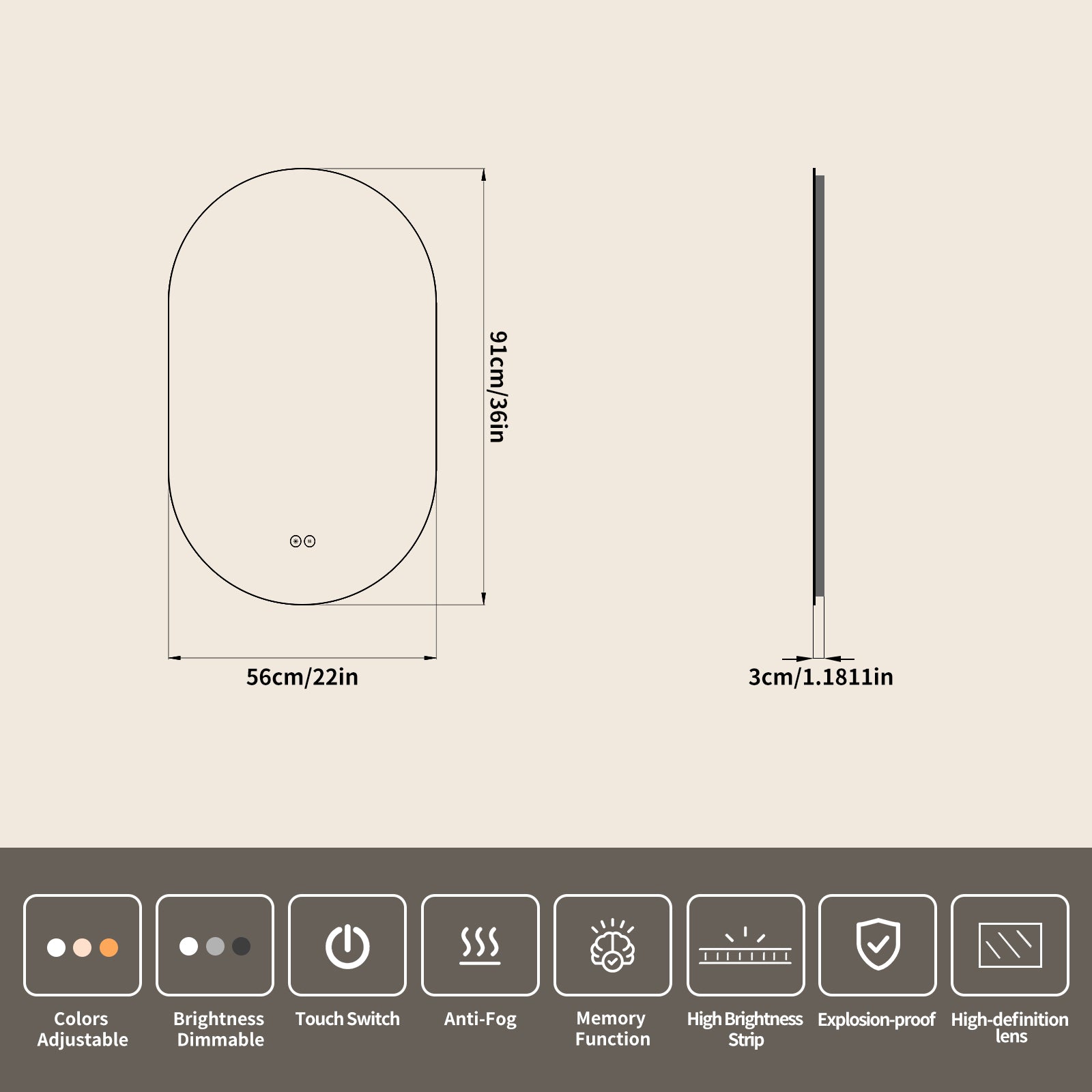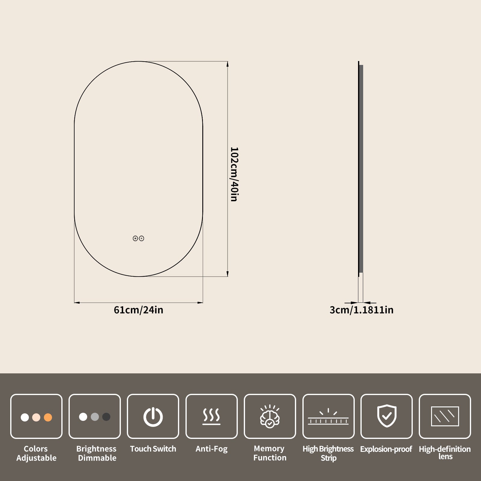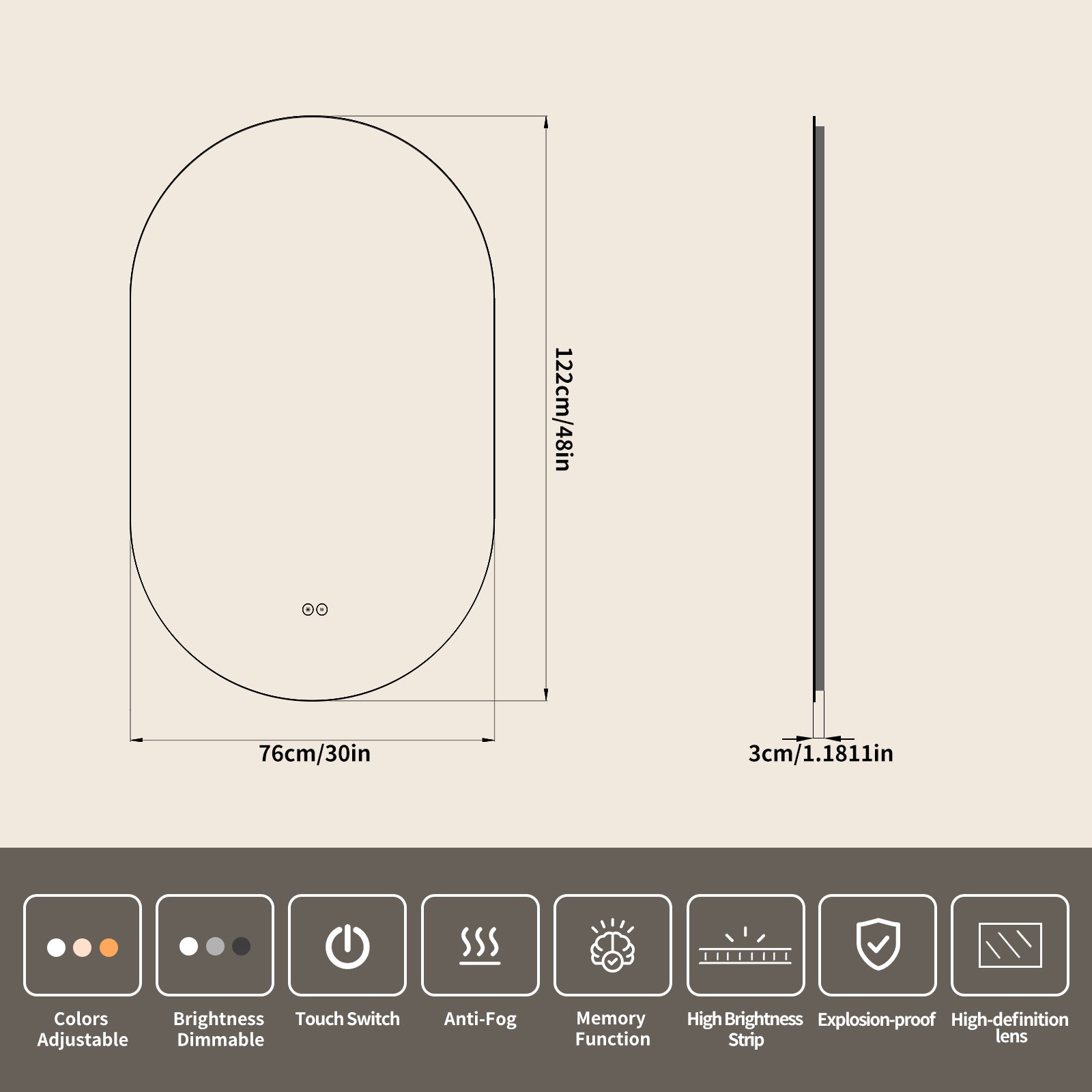 This wall-mounted frameless runway-style LED bathroom vanity mirror is made of 5mm environmental silver mirror. Its sleek oblong shape fits narrow walls and adds a modern touch, while the durable material resists humidity and daily wear for clear, undistorted reflections. It integrates a waterproof LED light (supporting 3 color switches and brightness adjustment), a full-surface fast defogging system tailored to its oblong shape, and explosion-proof technology. It also comes with all necessary installation parts and a detailed manual, enabling easy installation on walls of different widths and meeting needs like full-body outfit checks or detailed makeup.