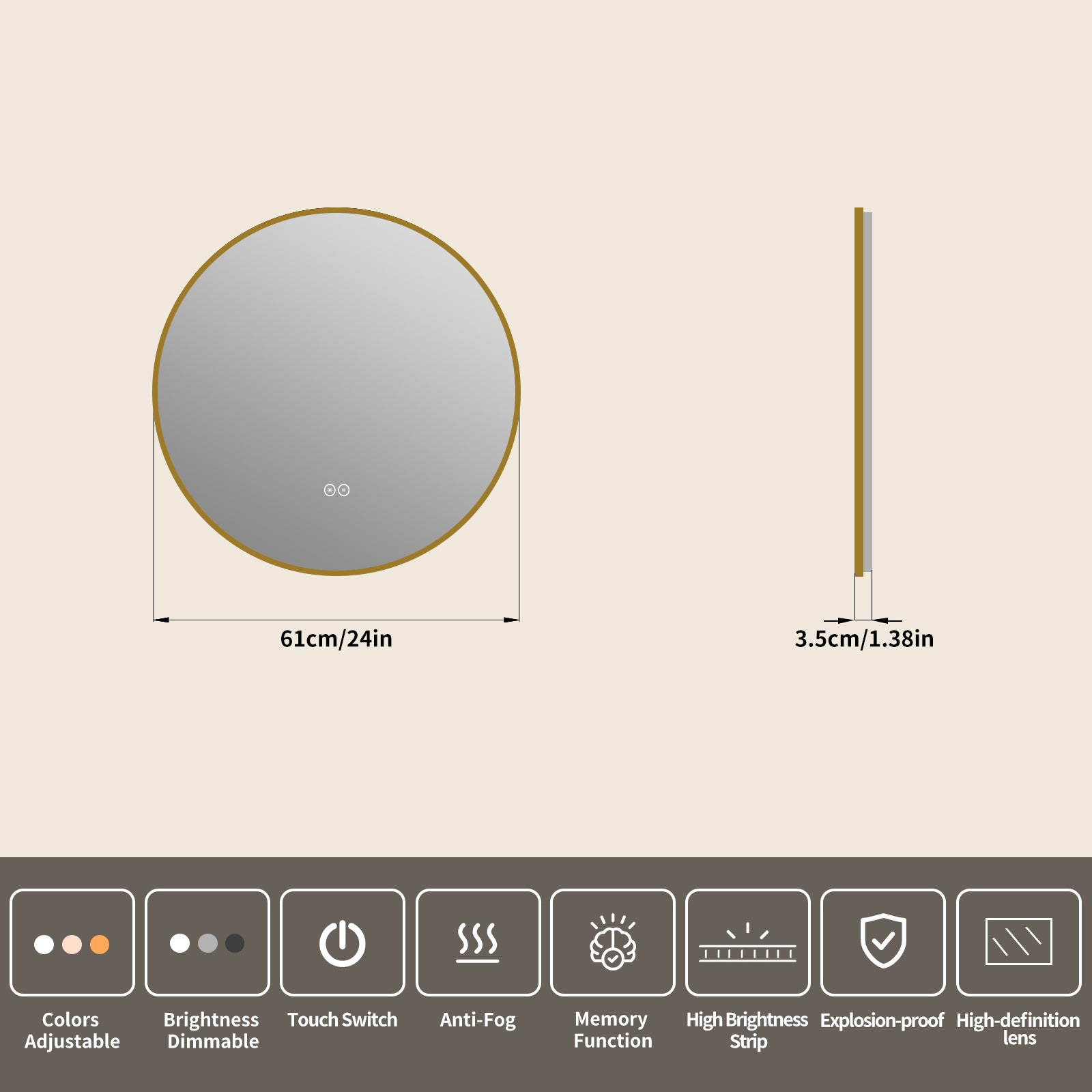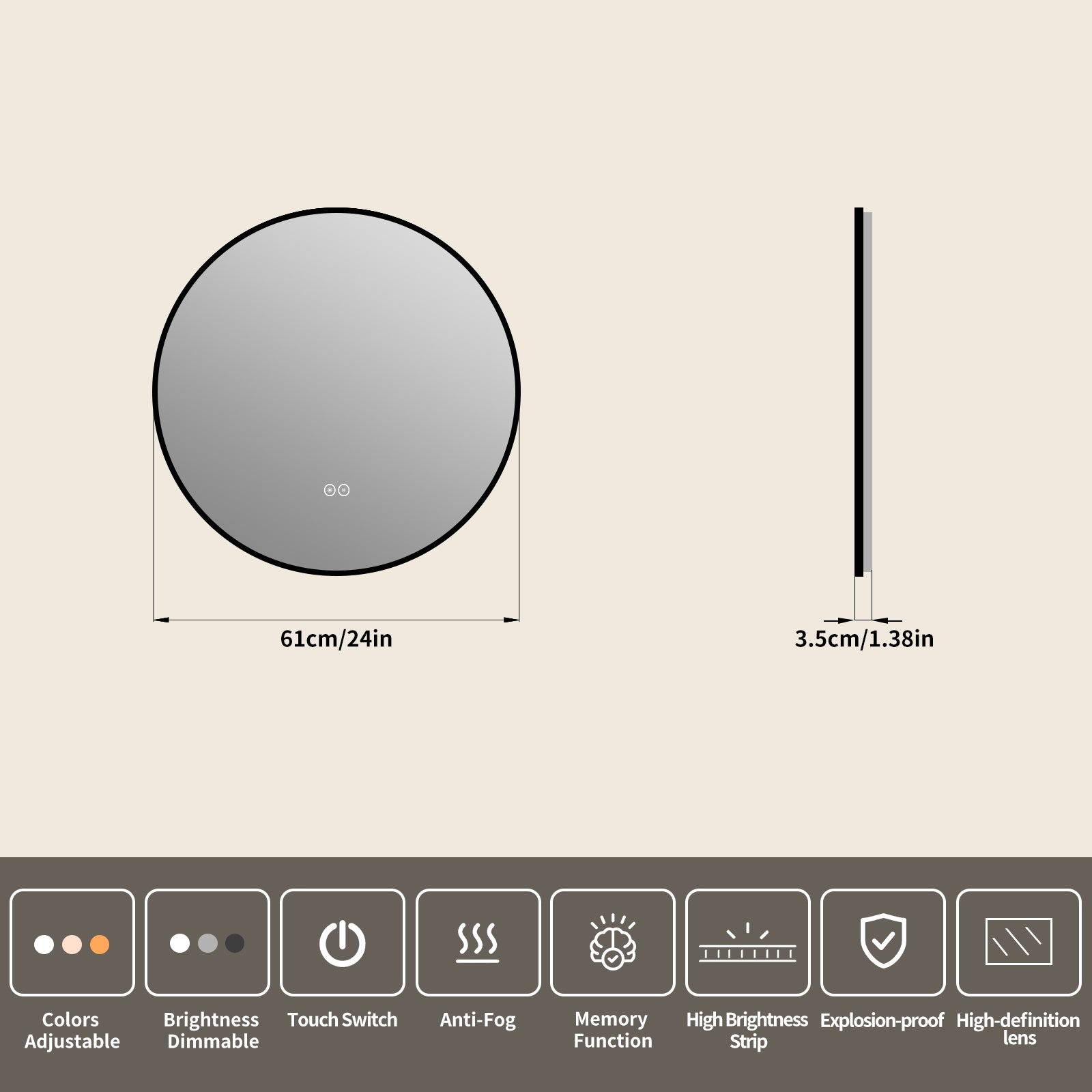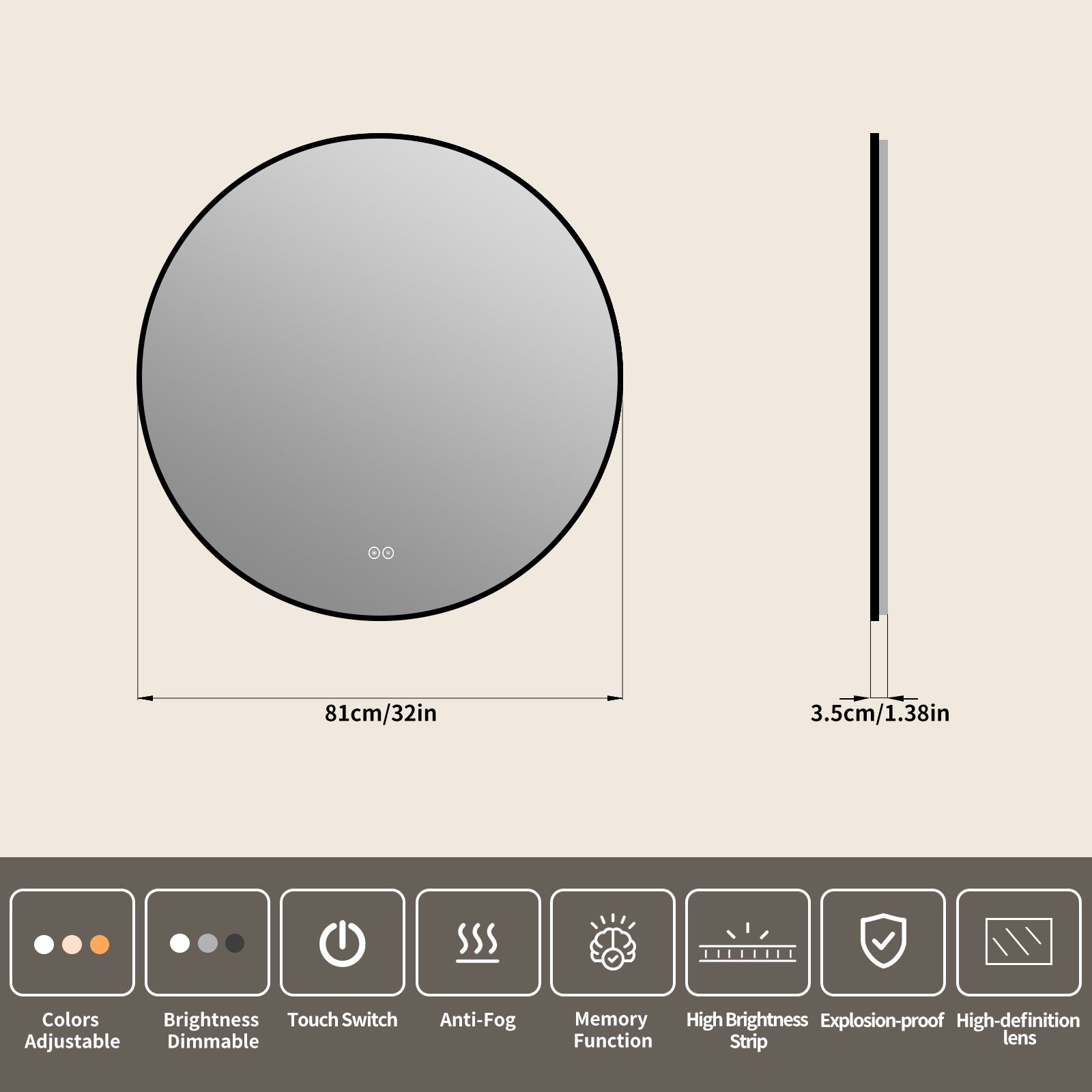 Yishare Round LED Framed Explosion-Proof Anti-Fog Bathroom Mirror